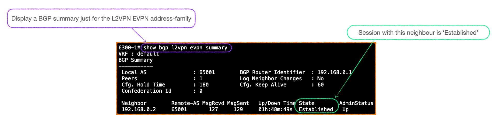 At this stage the BGP peers have established a BGP session and are both aware that the EVPN address-family is active.